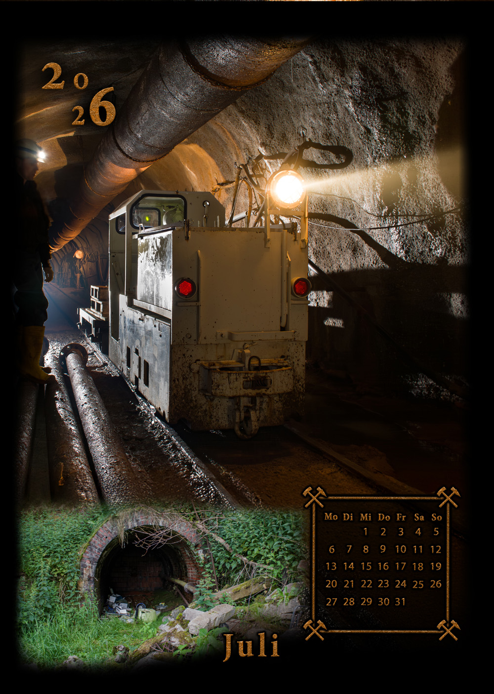 Holen Sie sich den beeindruckenden Untertagekalender für das Jahr 2026 aus dem Revier Marienberg, mit dem Titel „Stolln im Revier“.